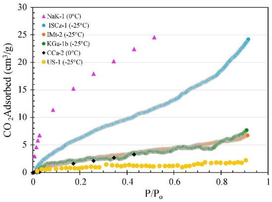 Using adsorption isotherm data for Utica shales, Sanguinito et al. [50] found that the standard BET (total) surface area measured for isotherm data from the so-called BET region (see below) remained relatively stable. However, quenched solid density functional theory (QSDFT) analysis, based on slit/cylindrical pores, performed on the same nitrogen isotherms, showed that the surface area and volume were largely just in the micropores, but that a substantial decrease in these parameters occurred after exposure to CO2. QSDFT-based analysis was additionally used to measure mesopore volume, and no significant change was seen in this range. Non-local density functional theory (NLDFT) was used to analyse CO2 absorption data to determine the volume and size distribution of ultra-micropores. Again, only very small changes were recorded in this range. DFT-calculated isotherms fitted the experimental data very well, with a maximum of 1% error. However, the apparently conflictual findings obtained by the different analysis methods for the adsorption data suggested the need for more accurate void space descriptors, which was addressed in subsequent work, as described below. Interestingly, CO2 adsorption on individual clay constituents demonstrated higher uptakes than those seen for the Utica shale sample itself (see Figure 3). This finding indicated that the constituents in the shale were inaccessible to CO2 even when the shale was ground to a fine powder.