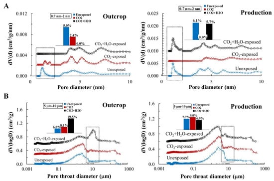 Pore size distribution analyses of the outcrop and production Utica shale samples: (A) 0.7 nm to 10 nm (from N2 sorption isotherms) (B) 0.003 μm to 350 μm (from Hg porosimetry). Insets show corresponding pore volume distributions of the unexposed, CO2-exposed, and CO2 + H2O− exposed samples for the 0.7 nm to 2 nm and 5 μm to 10 μm pore diameter ranges. Uncertainties are within ±5% and traces are offset from each other for clarity. Reprinted from Goodman et al. [25]. Copyright (2020), with permission from Elsevier.