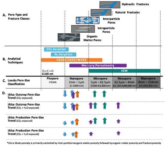 Schematic linking shale fracture and pore types and size classes with the analytical techniques applied to investigate the reactivity of Utica outcrop and production samples. (A) Fracture and pores present within mudrock: hydraulic fractures, natural fractures, interparticle and intraparticle pores associated with the mineral matrix, and organic-matter pores associated with the organic matrix. (B) Analytical techniques used to examine pore size distributions and porosity characteristics in mudrocks. (C) Pore size classification developed by Loucks et al. [52]. (D) Pore size trends with Utica outcrop and production samples following reaction with CO2 and H2O. Green arrows represent data from scanning electron microscopy, blue arrows represent data from CO2 and N2 low-pressure gas sorption isotherm measurements, purple arrows represent data from mercury intrusion porosimetry measurements, and orange arrows represent data from X-ray scattering methods. Reprinted from Goodman et al. [25]. Copyright (2020), with permission from Elsevier.