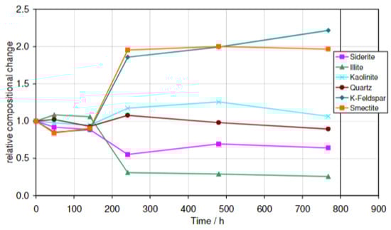 Busch et al. [58] investigated the interactions of wet CO2 over 32 days at 15 MPa and 50 °C, with Muderong shale. XRD analysis was used to track mineralogical changes over time, and the example data given in Figure 6 shows that a marked change was observed after 6 days in illite and K-feldspar content. Although illite content decreased and K-feldspar content increased, Busch et al. [58] did not detail the chemical processes that were taking place. The content of quartz and the small amount of kaolinite showed very little change in this experiment.
