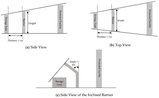 A barrier is currently installed around compressed hydrogen storage tanks or processing facilities producing hydrogen gas at HRSs according to the technical regulations when the separation distance requirement between the HRS and protected facilities located around the HRS is not met, as shown in Table 1 [,,]. The recommended separation distance in the regulations varies according to the capacity of the storage tank or the processing facility and the level of the protected facilities. In Table 1, the first class of protected facilities includes kindergartens, schools, hospitals, libraries, and buildings with an internal area greater than 1000 m2 []. The second class includes houses and buildings with an internal area of 100 to 1000 m2 []. When the barrier is installed at the HRS, its height and width are determined based on the linearly geometric relationship from the storage tank or the processing facility relative to the protected facility, as shown in Figure 1a,b, for preventing direct arrival of the damage from the hydrogen explosion site to the protected facility. The upper part of the barrier may be tilted at an angle within 90 degrees to cover the top surface of the storage tank with higher pressure when the barrier is installed around the storage tank (Figure 1c) [,,].
