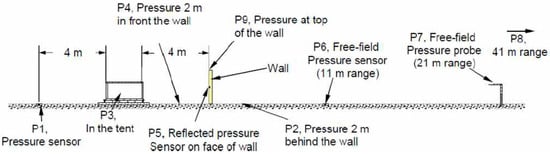 SRI performed an explosion test in an open space using a hydrogen–air mixture volume of 5.2 m3 (2.2 m × 2.2 m × 1.07 m) under a stoichiometric condition of 30 vol. % by varying the ignition method and existence of a barrier, as shown in Figure 2 and Table 2 [,]. A gas-mixing system consisting of small fans and sensors was used to create the stoichiometric condition of the hydrogen–air mixture in a tent region, whose boundary was enclosed by a thin plastic film. The barrier to reduce the peak overpressure was located 4 m from the right boundary of the tent, and its dimensions were as follows: a height of 2 m, width 10 m, and thickness 0.1 m. The experiment was initiated by igniting the hydrogen–air mixture with an electric spark device or a high-explosive material, in this case, 10 g of C-4 2.5 cm above the center of the bottom plate in the tent. The equivalent energy transferred by the electric spark for 2 ms was 40 J, and that of the explosive material was 5.2 × 104 J. The plastic film was quickly broken by a cutting machine along a supporting steel tube just before the start of the ignition. In these tests, an obstacle to accelerate the hydrogen flame in the tent was not installed. The overpressures were measured 2 m behind (P2) and 2 m in front of (P4) the barrier using a Kistler pressure transducer to ascertain the barrier effect on the overpressure reduction, as shown in Figure 2, as well as the effect on the overpressure inside the tent (P3). The overpressure was also measured 11 m, 21 m, and 41 m from the ignition point. In addition, the flame front time of arrival (TOA) in the tent was measured using six ionization pins installed along the horizontal and vertical directions from the ignition point, as shown in Table 3.