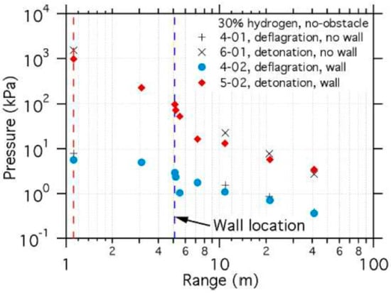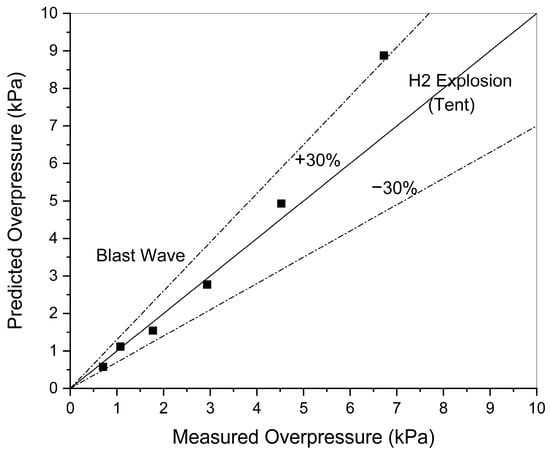 Finally, we propose the analysis methodology shown in Table 6 that is capable of accurately predicting peak overpressure variations through the barrier with an error range of approximately ±30% under a hypothetical VCE accident at an HRS on the basis of the hydrogen explosion test with a hydrogen–air mixture volume of 5.2 m3 under a stoichiometry condition as performed by SRI. This analysis methodology will be continually modified and validated using various test results, including the VCE at the mock-up facility of an HRS that includes dispensers, vehicles, and a barrier []. The methodology will then be finally established for VCE accidents at HRSs after simulating the test results with the barriers recommended by KGS.