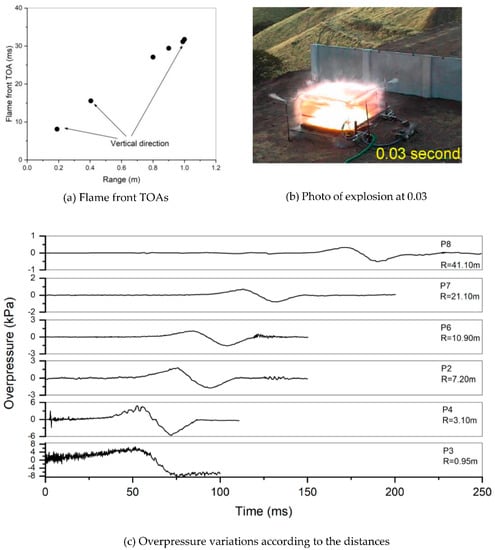 The overpressure data from the tests showed that the phenomenon of a hydrogen explosion varied greatly according to the ignition method used (Figure 3). The test ignited by the electric spark induced a deflagration with an overpressure increase of approximately 5.6 to 7.8 kPa for 50 ms in the tent, whereas the test started by the high-explosive material caused a detonation of approximately 1300 to 1350 kPa for 0.5 ms. The peak overpressure of 4.93 kPa at P4 was reduced to 1.75 kPa at P2 through the barrier during the deflagration test, and the peak overpressure of 231 kPa at P4 was decreased to 16.4 kPa at P2 during the detonation test. According to the measured data, the overpressure reduction ratio by the barrier in the range of 4 m was increased from approximately 64.6% to 93.7% as the explosion phenomenon changed from the deflagration to the detonation. The measured flame front TOAs and overpressure at P3 in Test 4-02 showed that the flame front arrived at all ionization pins in approximately 32 ms, whereas the peak overpressure was recorded at 51.4 ms as approximately 6.72 kPa. This time difference may mean that the combustion of the hydrogen–air mixture in the tent was completed at approximately 51.4 ms because the flame initially propagated along the horizontal and vertical directions, forming a semi-spherical combustion region, as shown in Figure 4b. The pressure increase feature at P3 in the tent affected the shape of the pressure wave from the tent to the far field through the barrier (Figure 4c), which was a typical pressure wave shape during the deflagration phenomenon. Therefore, we choose Test 4-02 as the first set of validation data for the modified XiFoam solver to predict the overpressure reduction by the barrier because the deflagration may be the dominant explosion phenomenon when a hydrogen vapor cloud explodes in an air environment [].