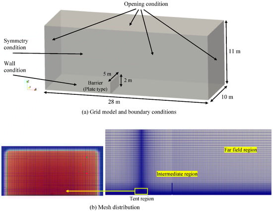 An open condition with the transmittance of a pressure wave [] was assigned to all the surrounding surfaces except for the bottom and half-cut surfaces. This allows for the inflow and outflow of fluid through the surfaces. A symmetrical condition was applied to the half-cut surface in the grid model. A wall condition of 283.45 K was assigned to the surfaces of the barrier and the bottom of the grid model. Regarding the radiative heat transfer calculation, an emissivity value of 0.072 was utilized for the bottom wall in the tent region based on the radiative property table []. The wall functions to calculate the turbulence quantities of k and ω were kqRWallFunction and omegaWallFunction, respectively [,,].