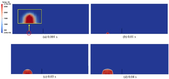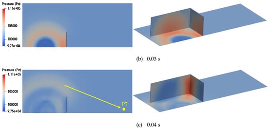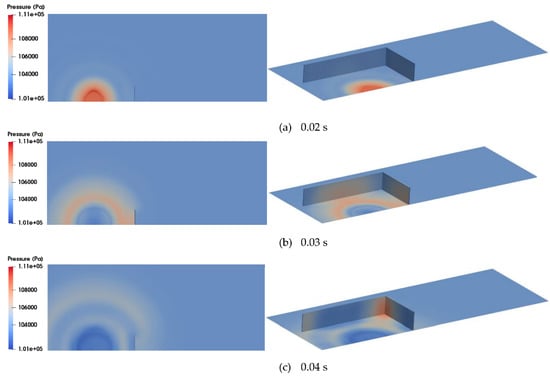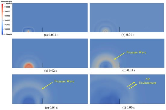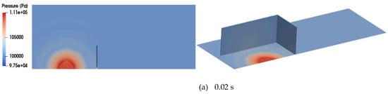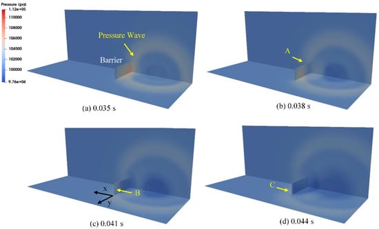The calculated gas temperature and pressure distributions over time according to the modified XiFoam solver, as shown in Figure 6, Figure 7 and Figure 8, reasonably simulate the gas explosion phenomenon and the pressure wave propagation from the tent region to the air environment through the barrier. Figure 6 shows that the gas temperature increases to approximately 2700 K from the initial temperature of 283.45 K as combustion takes place during the flame propagation process from the ignition point to the boundary of the tent region with the formation of semi-spherical shape. After hydrogen combustion is complete in the tent region, the hot gas mixture expands to approximately two times the initial tent region. As a result of this temperature increase in the combustion region, the pressure band generated around the outer surface of the combustion region, as shown in Figure 6c and Figure 7d, starts to propagate to the air environment while its magnitude decreases (Figure 7). In particular, Figure 8 shows that the pressure wave propagates continually at a reduced magnitude after colliding with the barrier in the rear region of the barrier (Figure 8b, “A”). Some of the pressure wave propagating along the horizontal x-direction undergoes a directional turn to the rear region of the barrier after passing along the inner surface of the barrier (Figure 8, “B” and “C”) despite its magnitude.