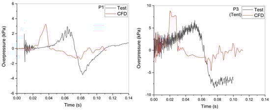 The characteristics of the pressure wave propagation through the barrier indicate that the calculated peak overpressures at P4 and P2, located 2 m in front and 2 m behind the barrier, respectively, rapidly decrease from approximately 4.9 kPa to 1.5 kPa. Subsequently, the peak overpressure from the region behind the barrier (P2) to the far field region (P6) continually decreases from approximately 1.5 kPa to 1.0 kPa as the hemi-spherical band shape of the pressure wave propagates over a distance of 4 m. As the pressure propagates further into the air environment, the calculated peak overpressure at P7, located 10 m away from P6, also decreases by approximately 0.7 kPa. However, the peak overpressure at 4 m from the left boundary of the tent (P1), where the barrier is not installed, is calculated as approximately 3.1 kPa. This value is approximately two times higher than the peak overpressures at P4 despite the different distance from the ignition point to the pressure sensor location. The comparison of the pressure wave behaviors at P1 to P7 between the test data and the CFD results shows that the CFD results accurately simulate the shape of the measured pressure wave (Figure 9) and their peak overpressures with an error range of approximately ±30% (Figure 10). Therefore, we find that the CFD analysis can reasonably simulate the peak overpressure reduction caused by the barrier if the analysis methodology is properly chosen.