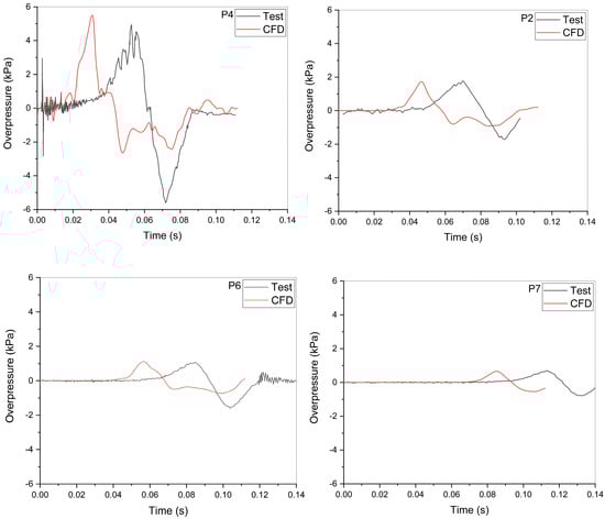 Comparison of the overpressure behaviors between the test data and the CFD results.