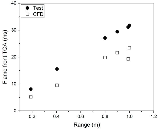 Comparison of the flame front TOA between the test data and the CFD results.