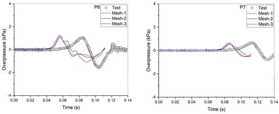 The sensitivity calculation results when investigating the effect of the mesh length during the pressure wave propagation process at the far field region (Figure 12) show that the variation in the predicted peak overpressures according to the mesh size is approximately ±10%. However, the calculated shape of the pressure wave using the grid model of Mesh-3 is slightly different at the descending slope after the peak when compared to other models.