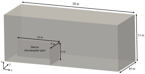 In order to evaluate the applicability of the proposed analysis methodology (Table 6) using the modified XiFoam solver in OpenFOAM to predict the peak overpressure reduction through the barrier and the pressure wave propagation from the near field to the far field of a hydrogen explosion site at an HRS, we introduced a rectangular barrier with different heights of 2 m and 4 m, as shown in Figure 13, because the barrier type, which will be installed around the hydrogen storage tank at the HRS, is likely to be determined as a rectangular shape with a higher height. To analyze the application cases, we applied the test condition of SRI 4-02 as the initial condition (Table 7) to simulate a hydrogen vapor cloud explosion, as this assumption can produce a convenient comparison between the different application cases. In Table 7, Case 1 is identical to the case of Mesh-1 in Table 4, of which the results are described in Section 4.2 and Section 4.3. The rectangular barriers with heights of 2 m and 4 m in the grid model were placed at the same location as the plate barrier in the x-direction; its distance from the tent boundary to the barrier wall in the y-direction was assumed to be 4 m, as shown in Figure 13. The mesh distribution in the grid models for Case 2 and Case 3 was generated on the basis of that of Mesh-1, as shown in Figure 5b, because the mesh distribution in the computational domain, particularly at the front region of the barrier, can affect the pressure distribution. Thus, the total number of cells generated in the grid model for Case 3 was increased to 3,807,512 cells from the number of cells generated (3,048,518) in Case 2. The boundary and initial conditions given in the CFD calculation for Case 1 (Figure 5a, Table 5) were identically applied to those of Case 2 and Case 3.