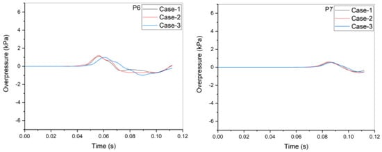 The CFD results for the application tests using the proposed analysis methodology are shown in Figure 14, Figure 15 and Figure 16. According to Figure 14 and Figure 15, the overall characteristics of pressure wave propagation in Case 2 and Case 3 from the tent region to the air environment are similar to those of Case 1. However, the extent of the reflected pressure wave to the tent region by the rectangular barrier is increased when compared to that in Case 1 because the barrier wall surrounds the tent region where the hydrogen explosion occurs. In particular, the rectangular barrier with a height of 4 m (Case 3) blocks and reflects more of the pressure wave from the explosion site compared to the barrier with a height of 2 m (Case 2). As a result of this effect of the rectangular barrier, the peak overpressure at 2 m in front of the barrier (P4) in Case 3 is approximately 17% higher than that of Case 1, as shown in Figure 16, whereas the peak overpressure at 2 m behind the barrier (P2) in Case 3 is approximately 23% lower than that of Case 1. Thus, we find that the damage reduction effect caused by the rectangular barrier with a height of 4 m is better than that by the other barriers. Moreover, the reflection effect by the rectangular barrier increases the calculated peak overpressure in the tent region (P3) and on the left side (P1), which is located 4 m from the tent boundary. However, the effects of the reduced overpressure by the rectangular barriers tend to decrease from the location of P6 and then almost disappear at P7, which is located at a distance of 21 m from the ignition point. This result can be explained by the fact that most of the pressure wave arriving at the P7 location comes from the pressure wave, which is located at the upper region of the barrier, as shown in Figure 15c. When considering these calculation results on the basis of the SRI test results using the plate barrier with a height of 2 m, we can judge that the proposed analysis methodology can be effectively applied for the simulation of VCE accidents at HRSs.