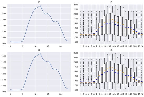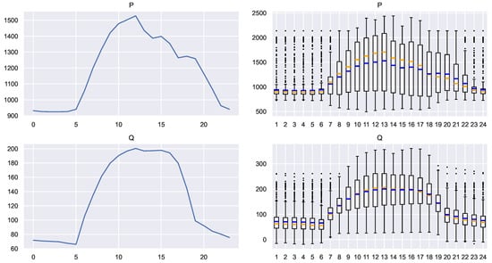 Average profile and corresponding box plots in kWh. Blue: mean. Orange: median.