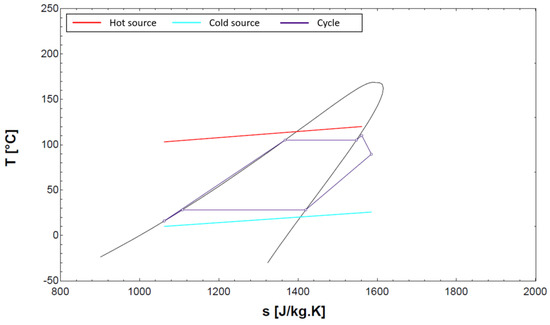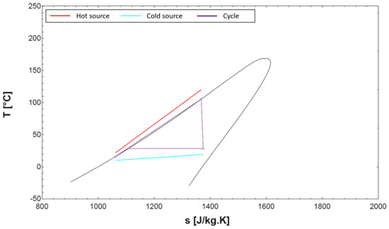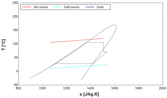 Trilateral flash cycle (TFC) is composed of the same components as an ORC; the only difference between the two cycles resides in the working fluid inlet quality at the expander inlet. Where, in an ORC, the working fluid enters the expander in a superheated form, in a TFC, the working fluid enters the expander in a liquid form at saturation and leaves the expander as a liquid–vapor mixture [16,17]. Thus, the temperature profiles between heat source and working fluid represent a better match, allowing for a decrease in exergy loss (Figure 2). However, the great difficulty with TFC resides in the type of expander that is permanently resistant to the presence of liquid droplets. Two expanders have been identified in the literature as being able to withstand these constraints: screw expanders [18,19,20,21,22,23] and scroll expanders [24,25]. However, volumetric expansion devices necessitate large machine sizes, which might not be economically viable in some situations: the economic viability is determined by the case under consideration [26,27].