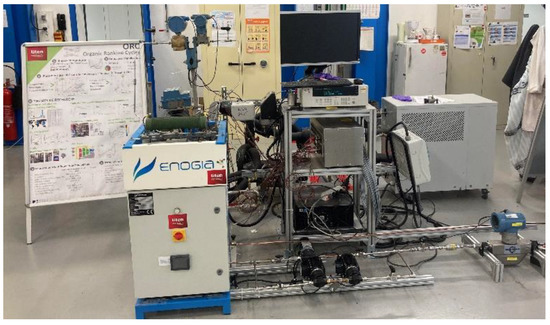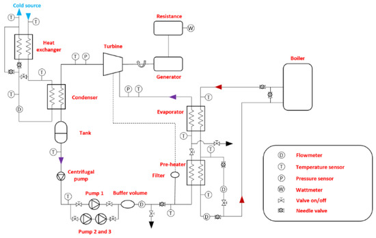 The process flow diagram (PFD) of the installation is shown in Figure 4 and a picture in Figure 5. The fluid at the entry of the volumetric pump is in a liquid state. Thanks to the volumetric pump, the working fluid flows to a high-pressure level. Then, the fluid is heated by two heat exchangers in series using water as heat source. This vapor, at high temperature and high pressure, is then expanded in a turbine. This expansion produces mechanical power which is then converted into electricity through a generator. The low-pressure vapor is then cooled by a plate condenser using water as a cold source, in order to go back into the pump.
