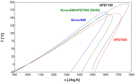 T-s diagram of Novec649TM, HFE7100, HF7000 and Novec649TM/HFE7000 mixture (50/50).