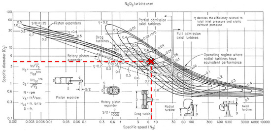 The Balje diagram, illustrated in Figure 7, provides the specific speed and diameter range at the design operation point for the different types of expansion systems. In the specific application, the conditions considered are detailed in Table 5. The calculated Ns and Ds, respectively around 7 and 4 (depending on the rotational speed and diameter supposed) suggested that the partial admission axial turbine was the best choice (with a total-to-static maximum isentropic efficiency of around 50%).