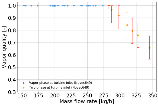 However, as explained earlier, in order to provide a clearer reading of the tests, the tests in Novec649TM were sorted with a quasi-constant hot and cold source. In Figure 8, we can observe that after a transition flow between single-phase and two-phase, the vapor quality is directly linked to the mass flow rate of the working fluid. The higher the working fluid mass flow rate is, the lower the vapor quality is. For the presented results, the vapor quality varies between 1 and 0.65. The high uncertainty level of the quality is due to the small temperature difference between inlet and outlet heat source.