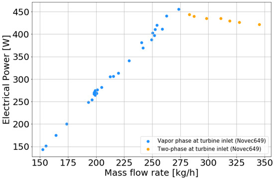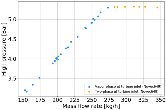 The results in Figure 10 show the adaptability of the cycle in the case of two phase in the turbine. Furthermore, it can be deduced from this pressure stability that the only factor that affects the power output in the two-phase operation is the working fluid mass flow rate, and more precisely the liquid mass flow rate. Thus, it can be anticipated that the vapor mass flow rate on the last single-phase point is the same for all the two-phase points. The excess mass flow rate would be working fluid in liquid form.