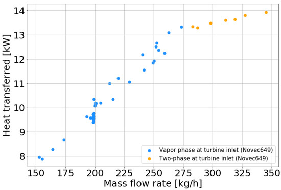 Moreover, in Figure 11, we can also observe that the transferred heat increases with the mass flow rate. Indeed, the augmentation of the working fluid mass flow rate increases the power exchanged at the exchanger until the exchange surface is no longer sufficient to evaporate the entire working fluid. However, even when the exchanger is no longer able to evaporate the entire working fluid, the total power exchanged continues to increase with the mass flow rate. In the two-phase operation, even though smaller than for the single-phase tests, the power transferred through the evaporator is still increased: 700 W for a quality down to 0.65, representing an improvement of 5% of heat transferred.