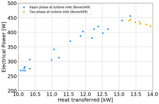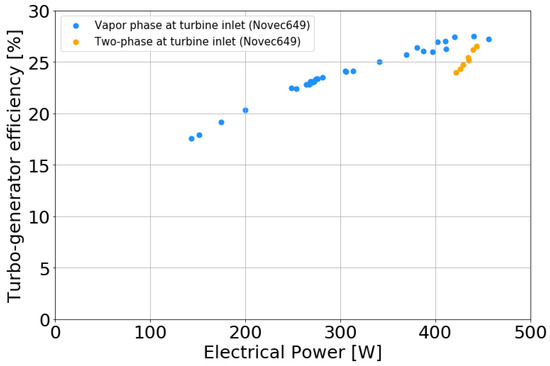 In Figure 12, it can be observed that the electrical efficiency of the turbo-generator increases with the power produced. We can also observe that the single-phase efficiency is, for any power, higher than the two-phase efficiency. Indeed, when changing from a single-phase to a two-phase fluid at the turbine inlet, the turbo-generator efficiency drops according to the vapor quality. Reducing the vapor quality from 1 to 0.65 leads to a decrease of four points of turbo-generator efficiency. Thus, even if the turbo-generator continues to produce power with a two-phase fluid flow, the efficiency of the turbo-generator in two phases will always be lower than the single-phase turbo-generator efficiency.