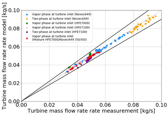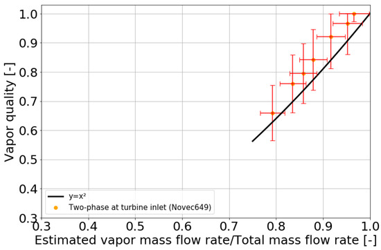 In Figure 13, we can observe the evolution of the vapor quality as a function of the mass flow ratio between the vapor mass flow rate and the total mass flow rate. In the two-phase regime, the vapor mass flow rate was estimated by assuming that the vapor mass flow rate in all two-phase tests is equal to the vapor mass flow rate of the design test (last point in single phase). We can make this assumption because all of the two-phase tests were performed under constant conditions at heat sources and identical turbine inlet pressures and temperatures. We can notice that the vapor quality of the working fluid decreases with the ratio between the vapor mass flow rate and the total mass flow rate. This decreasing curve shape is of the form of a power curve (y = with being between 1.5 and 2). This observation is in agreement with studies on nuclear turbines under critical mass flow rates and under two-phase conditions, which concludes on a quadratic relation between vapor mass flow rate, total mass flow rate and vapor quality [47]. This “model” is not expected to work for vapor quality close to zero due to changes in the working fluid behavior (liquid volume should be considered). Hence, due to the level of uncertainty, we propose to adopt the same relationship between vapor quality, vapor mass flow rate and total mass flow rate (Equation (6)): we consider this “model” as an accurate way to estimate the vapor quality at the turbine inlet.
