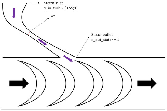For brevity, only an overview of the model is given here. When the fluid passes through the throat section of the stator , the Mach number is 1. This implies that the speed of the fluid in this section is equal to the speed of sound in the fluid. It is then, knowing , possible to determine the flow rate of the fluid flowing in the turbine (Equation (7)).