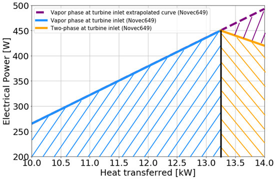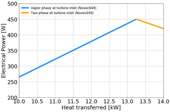 - Case 1: The turbine is only designed for single-phase operation. In this situation, only the blue part of Figure 20 makes electricity production possible and the maximum heat transferred at the evaporator is of about 13.3 kW.