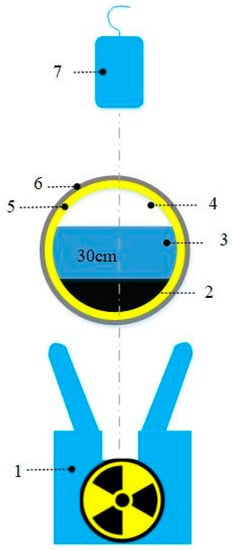 Structure simulated with MCNP code: (1) dual-energy gamma source, (2) oil, (3) water, (4) gas, (5) scale, (6) steel tube, and (7) sodium iodide detector.