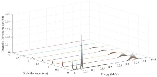 To simulate the detection structure, Monte Carlo N Particle (MCNP) code is used as a powerful tool in order to design of radiation-based systems. The structure of the introduced detection system consists of three parts: (1) A dual-energy gamma source. This source consists of 241Am and 133Ba radioisotopes, which are capable of emitting photons with energy of 59 and 356 keV, respectively. (2) A test pipe. This pipe is made of steel with a thickness of 0.5 cm and a diameter of 10 cm. Inside this pipe, three-phase flows are simulated in the stratified flow regime. There is a scale made of barium sulfate (BaSO4) with a density of 4.5 g/cm−3, uniformly with thicknesses of 0, 1, 1.5, 2, 2.5, and 3 cm. In each of these scale thicknesses, different volume percentages of oil, gas, and water have been simulated in the range of 10% to 80%: 7 different scale thicknesses × 36 different volumetric percentages in total. Two hundred and fifty-two simulations have been performed inside the test pipe. (3) A sodium iodide detector. The dimensions of this detector were 2.54 × 2.54 cm and it is located at a distance of 30 cm from the source. The structure simulated by MCNP code is shown in Figure 1. The signals received from the detector were collected and shown in Figure 2. In this figure, the x-axis represents the amount of source energy in MeV, the y-axis represents the thickness of the scale inside the pipe in centimeters, and the z-axis represents the amount of intensity absorbed by the detector in terms of count per source particle.