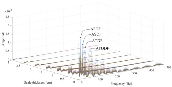 The signals transferred to the frequency domain were analyzed and the characteristics: amplitude of first dominant frequency to fourth dominant frequency (AFDF, ASDF, ATDF and AFODF), were extracted. Figure 3 shows the frequency domain signal diagram. In this figure, the x-axis represents the frequency in Hz, the y-axis represents the thickness of the scale (cm), and the z-axis represents the amplitude. The features extracted in this step are considered as neural network inputs to determine the scale thickness.