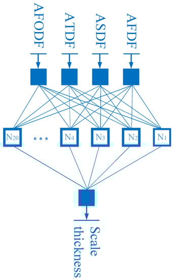 In which x represents the input parameters, b represents the bias term, w represents the weighting factor, and f represents the activation function. The index, i, is the input number, and j is the neuron number in every hidden layer. Although many mathematical approaches have been used in many fields of engineering sciences [,,,,,,,,,,,], the artificial neural network has always been introduced as a powerful tool in solving prediction and classification problems. The MLP neural network utilized in this study was trained and tested using MATLAB. While the software has numerous pre-built toolboxes for creating specific neural networks, the methods involved in training, validating, and testing neural networks have been meticulously programmed in this study to provide for maximum flexibility. It should be noted that the MATLAB ‘newff’ function was used to train the neural network. Following the deployment of several neural networks with varying numbers of hidden layers and numbers of neurons in each hidden layer, it was determined that a network structure with one hidden layer and twenty neurons in the hidden layer provided the most reliable estimates of the scale thickness within the pipe. As can be seen in Figure 4, the intended MLP network structure has been carefully planned. The details of the designed network can be seen in Table 1. To combat over- and under-fitting, the available data were separated into training data, validation data, and test data. The training data include the information observed by the neural network and used to make predictions. During the training process, the neural network was put to the test using validation data. As a follow-up to the training phase, the neural network was next put to the test on a set of data designed specifically for that purpose. So long as the neural network responds appropriately to these three datasets, the proposed network will be safe from over- and under-fitting problems. From the 252 signals received from the simulations, the 4 mentioned characteristics were extracted, and finally a 4 × 252 matrix was obtained. This matrix was used to implement the neural network, of which about 70% of samples (176 samples) were used for training, and the other 30% were used for validation (38 samples) and for network testing (38 samples). Following the deployment of several neural networks with varying numbers of hidden layers and numbers of neurons in each hidden layer, it was determined that a network structure with one hidden layer and twenty neurons in the hidden layer provided the most reliable estimates of the scale thickness within the pipe. As can be seen in Figure 4, the intended MLP network structure has been carefully planned.