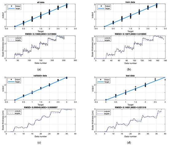 Regression and fit plots for: (a) all data, (b) training data, (c) validation data, and (d) test data.