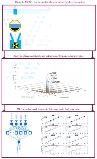 To graphically display the accuracy of the network, two graphs of regression and fitting are suggested in many studies [,,,,,,,,,,,,,]. These graphs for training, validation, testing, and all data can be seen in Figure 5. In the regression diagram, the neural network output is shown with a black star and the target output is shown with a blue line. In the fitting diagram, the target is shown with a dashed line and the output of the neural network is shown with a black line. The current research has been compared with previous research in terms of the number of detectors, the type of neural network used, the type of source, the feature extraction method, and the error of the introduced system in Table 2. The high accuracy obtained in this research is due to the frequency characteristics of the signal. The use of these characteristics, in addition to reducing the size and volume of calculations, has significantly increased the learning speed and accuracy of the neural network. The problems of transporting radioisotope devices, the inability to turn them off, and the risk to the health of people who work with radioisotopes are among the limitations of this research. In future research, in addition to the mentioned limitations, researchers in this field can investigate the performance of different artificial neural networks and even the performance of deep neural networks. In addition, the use of time features, wavelet transform, and innovative methods for extracting suitable characteristics are suggested to researchers in this field. Figure 6 depicts the whole procedure of the provided approach for estimating the scale thickness within the pipe. In the initial phase of the detection system’s architecture, as seen in the figure, the MCNP code simulated the flows moving through the pipe and the varying thicknesses of the scale inside the pipe. Each simulation’s received signals were then analyzed to obtain the four characteristics of AFDF, ASDF, ATDF, and AFODF. The collected features were sent into a multilayer perceptron (MLP) neural network, which was then used to make predictions about the scale thickness within the pipe. After the neural network had been trained, its performance was checked by comparing its output with the desired outcome.
