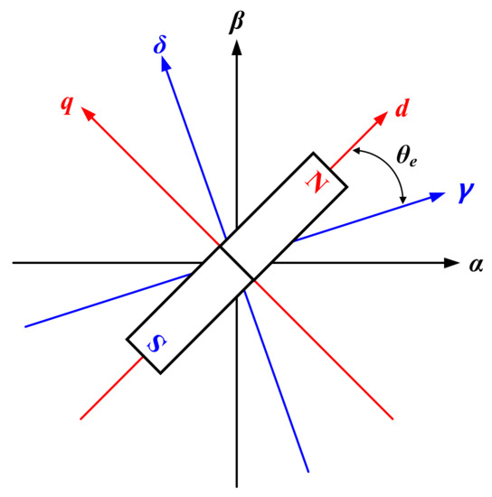 Figure 1 shows stationary and rotating reference frames. The α-β frame is a stationary frame fixed to the stator winding. The d-q rotating reference frame is also known as a synchronous reference frame. In this coordinate system, the d-axis indicates the N pole direction of the permanent magnet. The q-axis indicates a direction that is 90 degrees in front of the d-axis by the electrical angle [21]. The IPMSM voltage equations for the d-q rotation reference frame are expressed as (1) and (2):