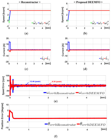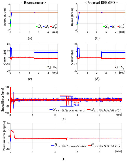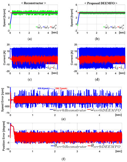 Figure 10 represents a summary of the simulation results, provided that the IPMSM parameters changed by 30%. The speed error of the reconstructor is greater than the proposed DEEMFO. The detail value is shown in Figure 10. The speed error is approximately 825.6 rpm when the reconstructor is used. However, when applying DEEMFO, the speed error is around 298.7 rpm. This means an error improvement of about 63.8%.