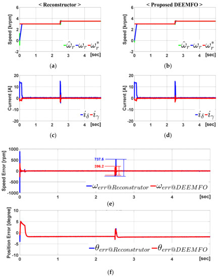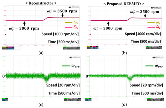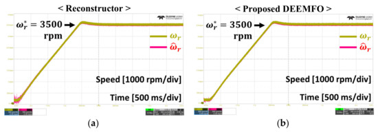 Figure 8 summarizes the results under the condition that the speed command increased from 3000 rpm to 3500 rpm. When the speed command increases at 2.5 s, a speed error occurs. At this time, the speed error when using the reconstructor is 737.5 rpm, and the speed error when using the proposed DEEMFO is 396.2 rpm. This means an error improvement of approximately 46.3%.