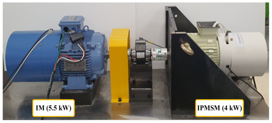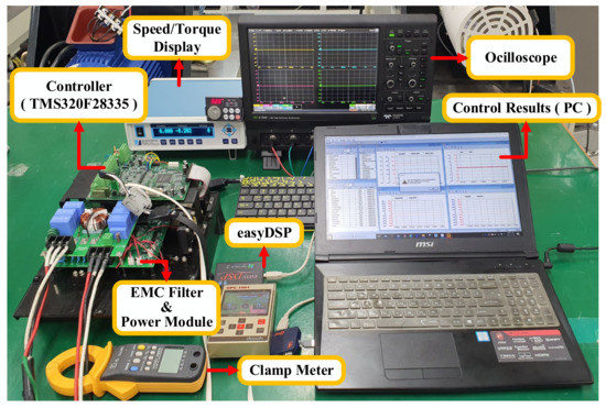 Figure 11 shows the M-G set wiring diagram for the experiment. The DSP TMS320F38225 controller, M-G Set, and measuring equipment are connected. Three-phase power is applied to the IPMSM through the power module. The encoder, an IPMSM position sensor, is connected to the controller to measure the actual position, but this position information is not used for actual control as it is sensorless control. The 5.5 kW induction motor (IM) for applying load torque operates via a commercial driver. The control system consists of the controller and easyDSP to output parameters such as position, speed, voltage command, and current command from the IPMSM and a torque sensor/display for checking speed and torque. A 12-bit oscilloscope was connected to obtain a waveform as a result of the experiment. The experimental devices are shown in Figure 12 and Figure 13.