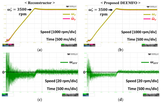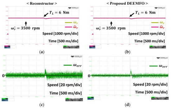 Through simulations and experimental results, the proposed DEEMFO shows a better speed control performance than the reconstructor under four conditions. As a result of analyzing the speed error of the reconstructor and DEEMFO, the speed error was improved by at least 10%. To be more precise, in the no-load condition, the error improvement effect of about 33.4% and about 20% compared to the reconstructor was proven in simulation and experiment, respectively. Error improvements of about 46.3% and about 20.0% in the simulation and experiment under the speed fluctuation condition and about 10.1% and 22.5% under the load fluctuation condition were proven, respectively. In particular, in the presence of parameter variations and errors, DEEMFO improves error by about 63.8% in simulation and about 37.6% in experiment.