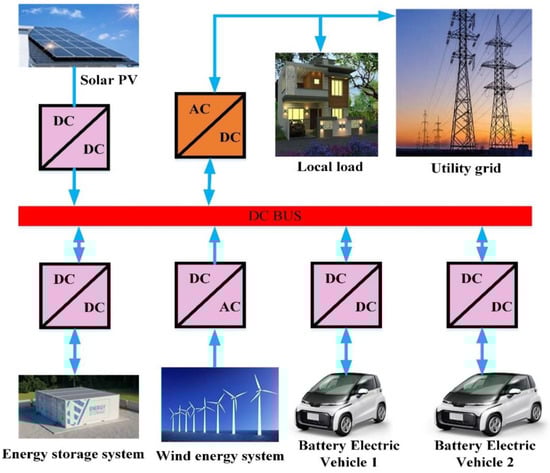 The DC-DC converter topologies that are to be used in a PV-based power supply should meet the conditions given in the subsequent paragraphs. A typical layout of DC microgid is depicted in Figure 4. Without increasing the stack size, we can obtain the desired DC voltage value with the help of the DC-DC converter. For example, the DC output from the polymer electrolyte membrane (PEM) FC stack is mostly around several tens of volts. Therefore, the ripple current value observed across the PV due to the DC-DC converter switching should be low. Most importantly, a sharp rise or a fall in the current and high-frequency current ripple of a large magnitude should be avoided [].