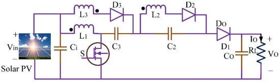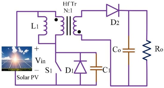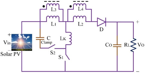 A high step-up DC-DC converter is required to boost the voltage value generated through the 400 V DC bus voltage PV. Passive loss clamped technology is used to improve efficiency and limit voltage stress. Recycling of leakage energy is possible with the help of passive losses clamped technology. The basic boost converters’ main disadvantages include problems with the electromagnetic interface, high voltage stress and hard switching on the semiconductor elements []. Coupled inductor DC-DC buck-boost converter is used for a step up and down by non-inverting voltage, this also offers high efficiency, control and regulation of input and output currents smoothly and immediately [].