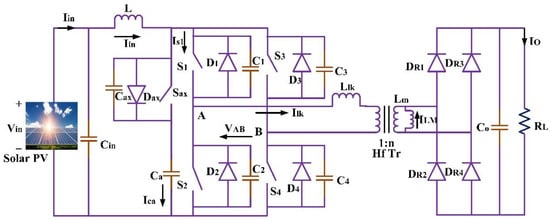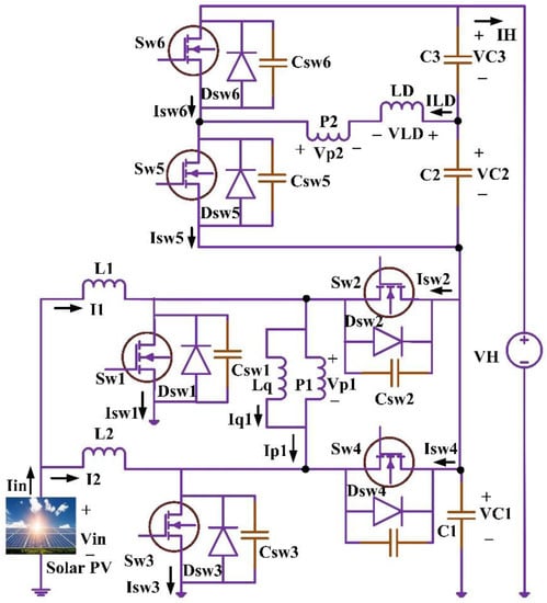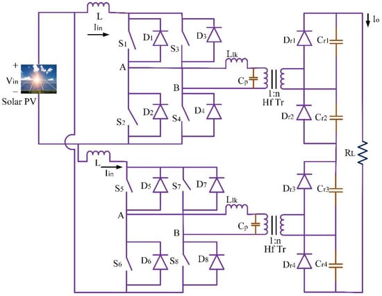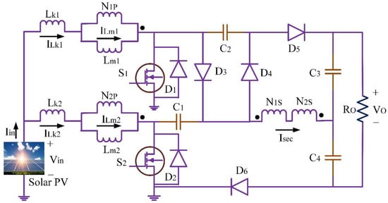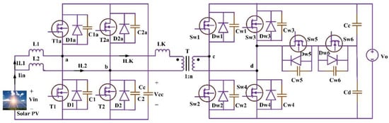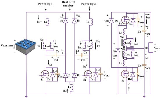 All diodes and switches operate on ZVS and ZCS techniques in the interleaved full soft-switching DC-DC converter. To reduce the power loss and to increase the efficiency of the DC-DC converters, the ZVS and ZCS are used. Finally, the auxiliary circuit is placed out of the main power path to avoid the switches’ high current and voltage stress []. The schematic circuit diagram of interleaved high step-up converter is depicted in Figure 11. A highly efficient power system always insists a reliable DC-DC converter. An interleaved boost converter is required to convert the high-current low-voltage to low-current high-voltage.