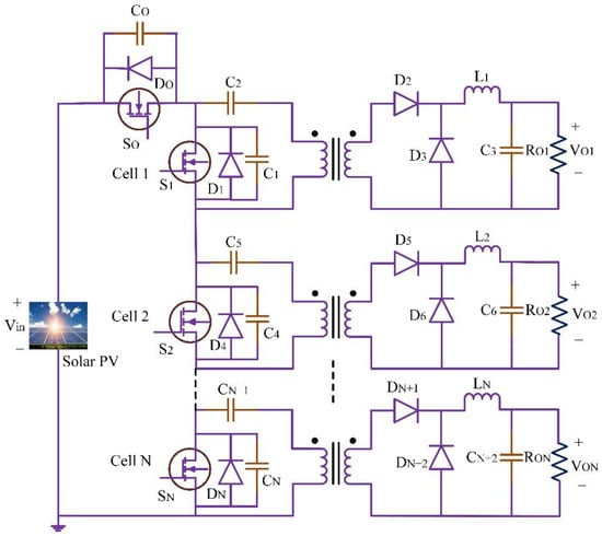 The converter’s efficiency of 92% to 94% for the entire Vin range and 300 W output power. A 300 W high step-up ratio converter for low-voltage and high-current energy sources is proposed []. The clamping diode integrated with boost-flyback (IBF) topology that naturally clamps parasitic oscillations. Resonance caused by the parasitic components helps to increase the voltage gain. The Vin range is 25–35 V, and Vout is 400 V. Various parameter has been evaluated and summarized in Table 3 for various converters. A simple design of asymmetrical forward cells of stacked multiple output topology is depicted in Figure 14.
