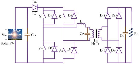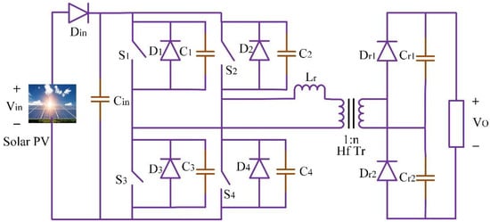Below, Figure 19 shows the Series Resonant Converter topology (SRC). This paper [] uses a parallel tank circuit formed by an (L-C)||L combination to achieve soft switching of high-frequency switches. The important feature of these converters including (1) Achieving an improved efficiency even at varying load and line conditions. (2) A wide range of soft switching ZVS can be achieved. (3) The Peak current capability of the switch varies with the input current variation and not with the load current changes.