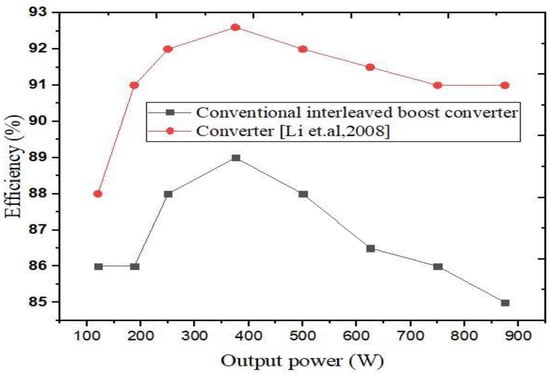 The comparison of measured efficiency in converter [] and conventional boost converter is given in Figure 23. The conversion of 40 V to 380 V DC-DC gives the maximum efficiency of 92.6%.