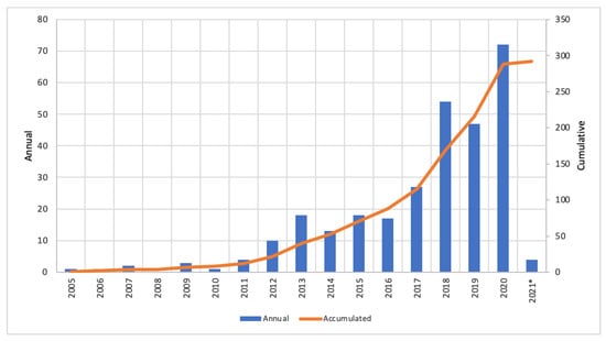 Reviewed studies by year (annual and cumulative). Source: Authors’ own elaboration. * forthcoming studies.