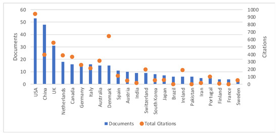 The authors are affiliated in organizations from 44 different countries from all continents, thus forming a global community. The countries that stand out in terms of the number of articles and total citations are presented in Figure 3.