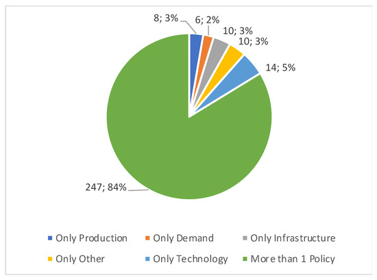 Most studies are addressing policies related to production and technology, while demand and infrastructure earn a slightly lower attention (Figure 5). It is worthy to mention that most of the papers cover more than one policy recognizing the need for a policy-mix that tackles the several dimensions that influence the adoption of EVs, as stressed by the literature [5,8,9]. In fact, only 16% of the papers are focusing on a single policy type (Figure 6), studies focused on technology being the most frequent.