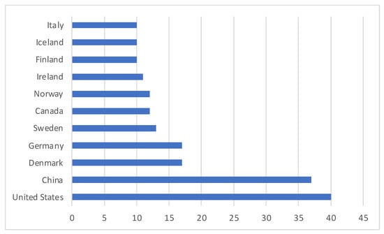 Although many papers (54) have a global nature, that is they study the promotion of EV powered by RES without addressing a specific country, it was possible to identify studies on 57 countries from all over the world. Several countries are attracting more attention from scholars, namely from the North America (the USA and Canada), China and European Countries as shown in Figure 7.