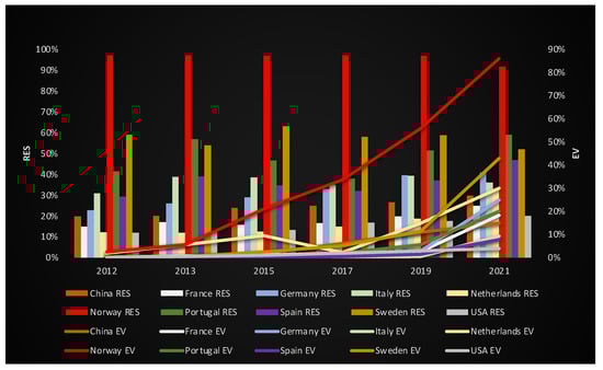Among the countries that show a balance between the diffusion of EVs, and RES is the Netherlands (in 2019, it registered 19% of penetration of RES and 15% of EVs market share) and Norway (in 2019, it registered 92% of RES and 86% of EVs market share). Another aspect observed is that countries that lead vehicle sales volumes have low EVs market share, as is the case of the USA (in 2019, it registered 18% of RES and 3% of EVs market share) and China (in 2019, it registered 27% RES and 11% EVs market share).
